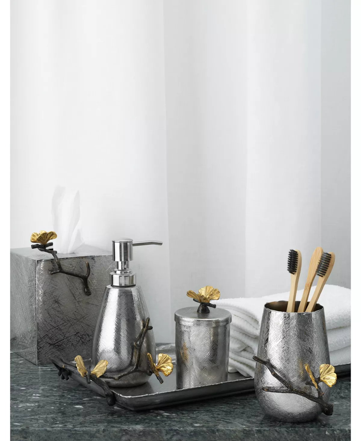 The Butterfly Ginkgo Collection celebrates the representation of flora as fauna. Michael’s fascination with a particular type of ginkgo tree, the ginkgo Biloba, or “Butterfly ginkgo”, which grows with a double leaf reminiscent of a butterfly’s wings, gave rise to a fantasia image of the plant. Executed at the highest level of hand craftsmanship, each piece is rendered in solid bronze with acid etched cocoon-shaped vessels. The pieces in the collection are a tour de force of Indian craft and capture the poetic spirit that is so deeply indicative of Michael’s work. The first time I saw this tree, it literally looked like it had been completely overtaken by butterflies…as if they would all take flight the moment I walked too close or made a noise. The idea that the leaves could evoke the beauty of butterflies was magical to me, like trees that can metamorphose from flora to fauna in the blink of an eye.