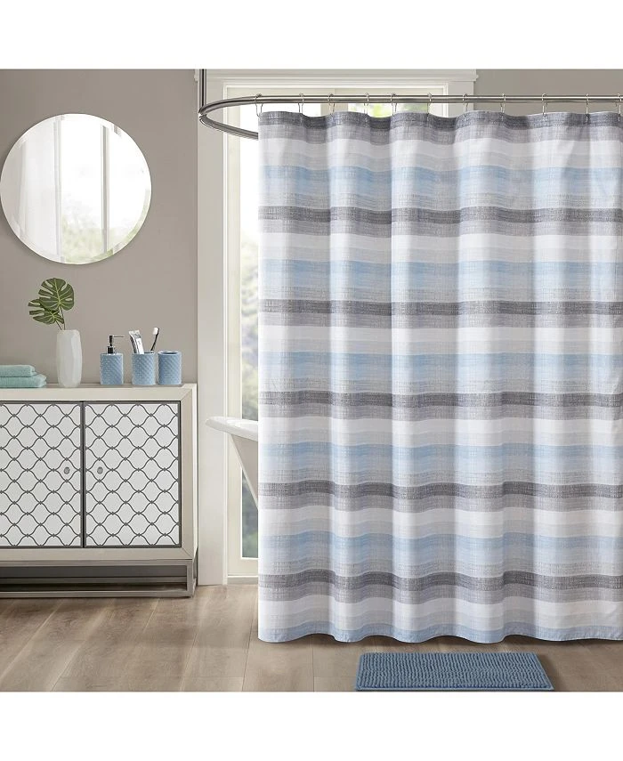 The 17pc Chambray Stripe set includes: a 72″ x 72″ chambray stripe shower curtain, 12 rollerball hooks, 17″ X 24″ noodle rug, 7.5″ X 3″ lotion pump, 4″ X 3″ tumbler, & a 4″ X 3″ Toothbrush holder. This set will complete and elevate any look to your bathroom. Shower curtain is 100% polyester & machine washable. The Noodle rug is also machine washable for easy care.